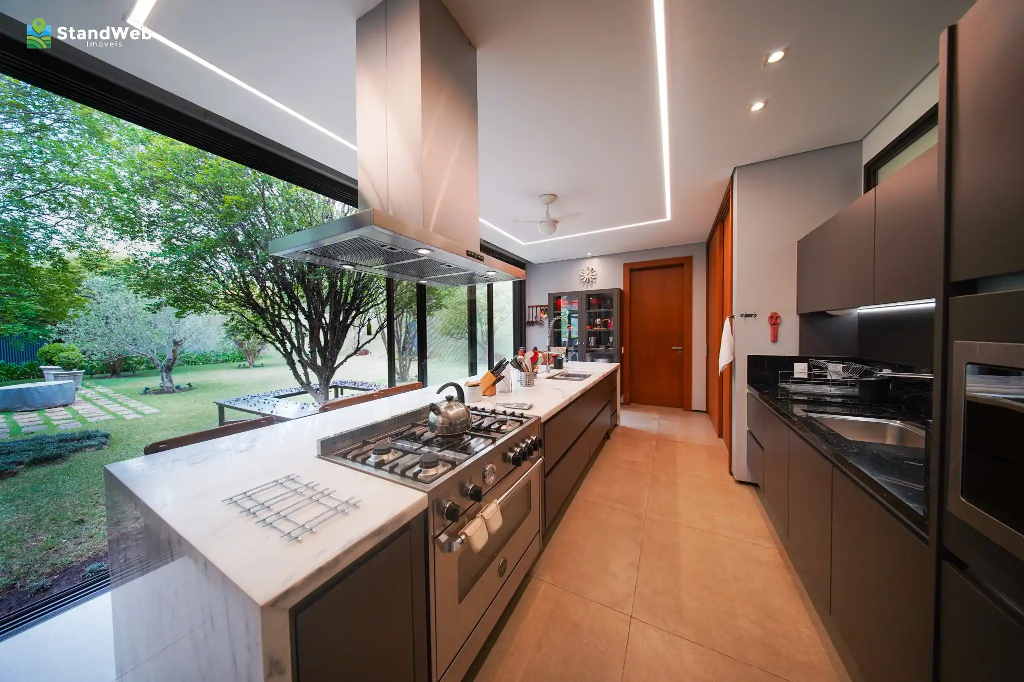 A cozinha, planejada com copa, despensa e louçaria, foi pensada para quem aprecia praticidade sem abrir mão da elegância.