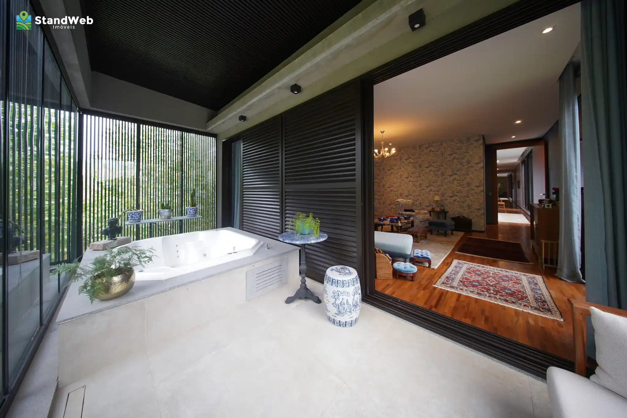 Toda a casa conta com ar-condicionado em todos os ambientes, aquecimento de água por boiler com apoio elétrico, e irrigação automatizada abastecida por poço.