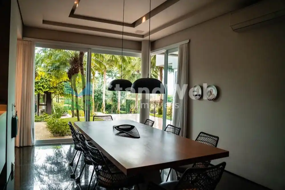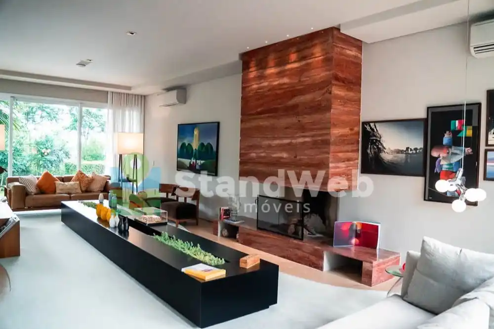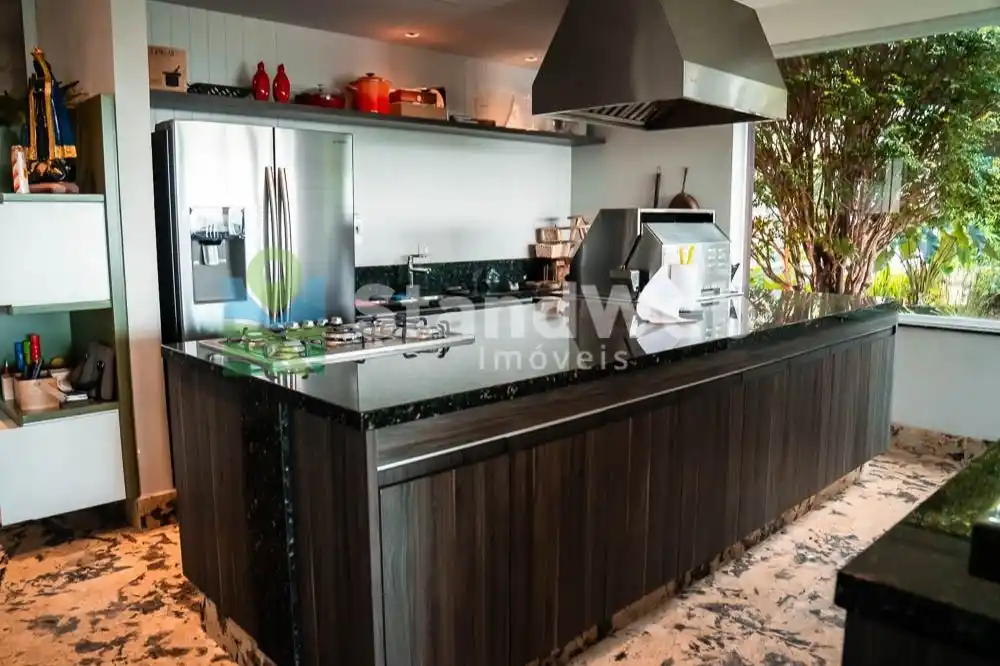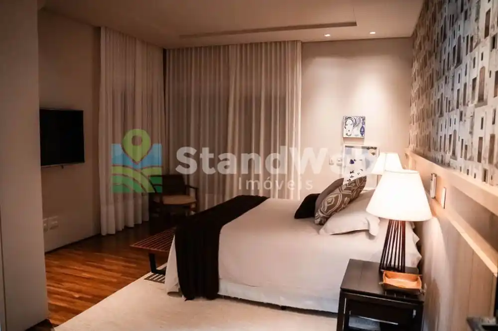 São 7 suítes, incluindo uma máster espetacular com banheira, lareira, closet e sala de banho em mármore Nero Striatto. Ambientes revestidos em travertino, decoração com peças importadas e obras de arte, home theater completo e climatização total com 16 máquinas Fujitsu.